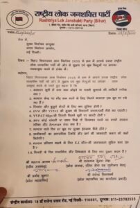 पटना। आगामी बिहार विधानसभा आम चुनाव 2025 को लेकर राष्ट्रीय लोक जनशक्ति पार्टी (RLJP) ने मुख्य निर्वाचन आयुक्त, भारत निर्वाचन आयोग, नई दिल्ली को एक महत्वपूर्ण पत्र भेजा है। इस पत्र में पार्टी ने चुनाव की पारदर्शिता, मतदाता सुरक्षा और निष्पक्षता को लेकर 10 महत्वपूर्ण बिंदुओं पर सुझाव और सवाल रखे हैं।पार्टी ने कहा कि लोकतंत्र की मजबूती के लिए पारदर्शी चुनाव जरूरी हैं, इसलिए आयोग को जनता के भरोसे को बनाए रखने के लिए ठोस कदम उठाने चाहिए।
