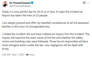 मुख्यमंत्री सावंत ने दुर्घटना को “गोवा के लिए बेहद दुखद दिन” बताया और कहा कि आग लगने के कारणों, सेफ्टी स्टैंडर्ड और बिल्डिंग नियमों की जांच की जाएगी। उन्होंने आश्वासन दिया कि लापरवाही पर सख्त कार्रवाई की जाएगी।