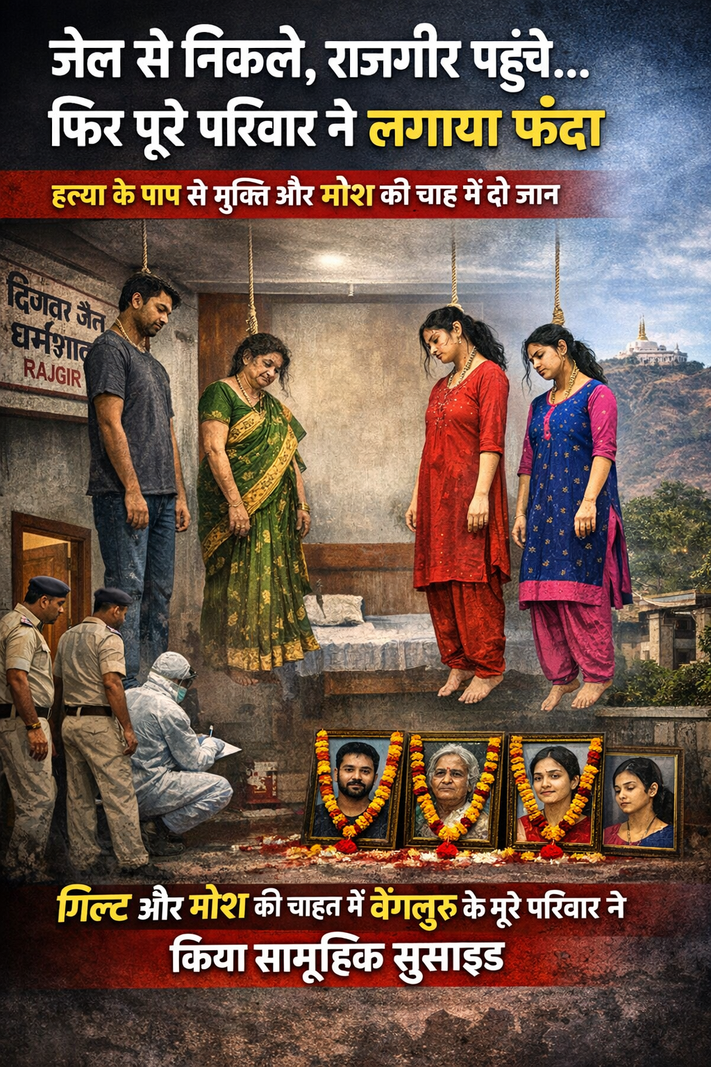 बिहार के मशहूर टूरिस्ट डेस्टिनेशन राजगीर में सामने आई चार मौतों की रहस्यमयी गुत्थी सुलझ गई है। पुलिस जांच में खुलासा हुआ है कि यह कोई हादसा नहीं, बल्कि गिल्ट (अपराध-बोध) और मोक्ष की चाह में किया गया सामूहिक आत्महत्या (Mass Suicide) का मामला है। दिल दहला देने वाली इस घटना में बेंगलुरु के एक ही परिवार के चार सदस्यों ने अपनी जान दे दी।