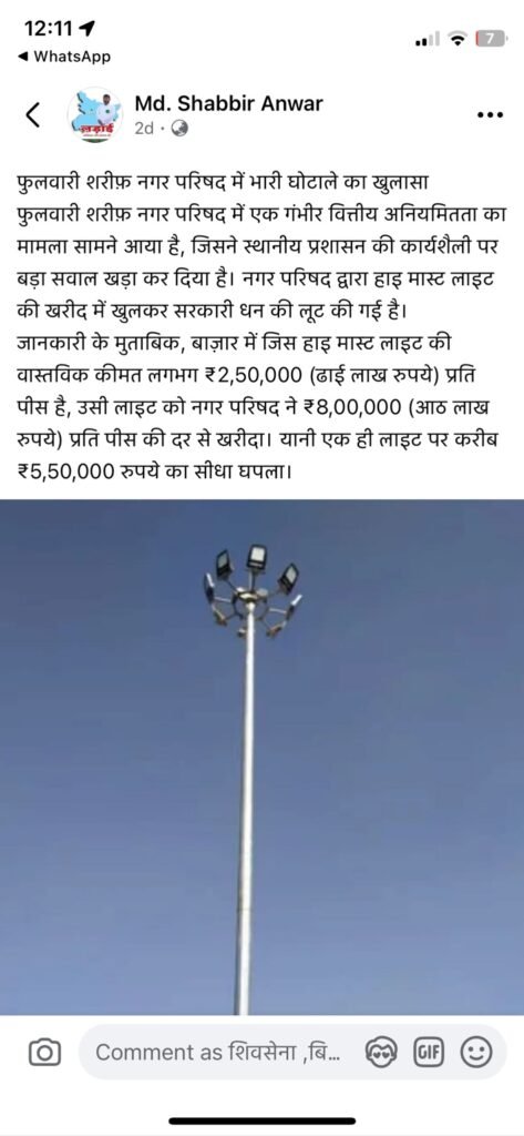 फुलवारी शरीफ नगर परिषद एक बार फिर सुर्खियों में है। इस बार मामला विकास कार्यों से जुड़ा है, लेकिन आरोप गंभीर वित्तीय अनियमितता के हैं। सोशल मीडिया पर वायरल एक पोस्ट में दावा किया गया है कि नगर परिषद द्वारा खरीदी गई हाई मास्ट लाइट की कीमत बाजार दर से कई गुना अधिक दिखाई गई है। पोस्ट के अनुसार, जहां बाजार में एक हाई मास्ट लाइट की अनुमानित कीमत लगभग ₹2.50 लाख बताई जा रही है, वहीं नगर परिषद ने कथित रूप से उसे ₹8 लाख प्रति पीस की दर से खरीदा।